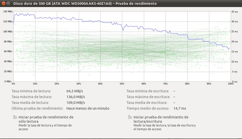 Lo primero que hicimos fue un test de rendimiento desde la utilidad de discos de Ubuntu, que da unos resultados bastante curiosos como podéis observar en la imagen.