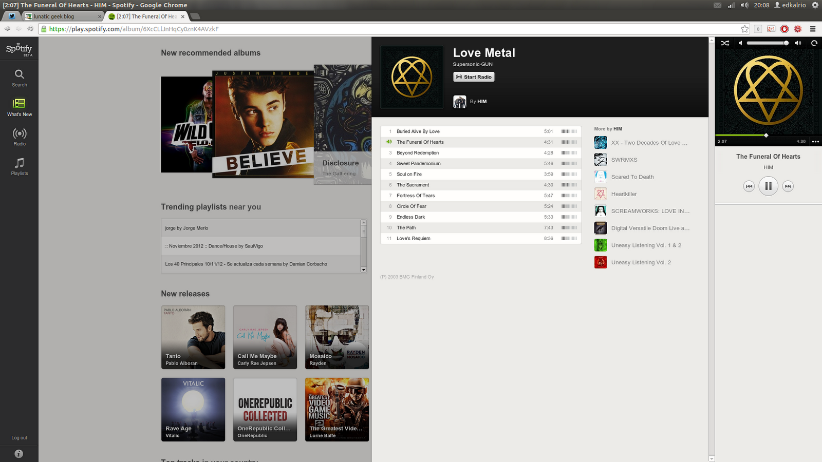 La conclusión a la que llegamos después de probar durante todo el fin de semana esta web app es que es mejor que la versión de escritorio nativa de Linux. Pero esto es tan bueno que no puede ser cierto. Me refiero a que llevo oyendo todo el fin de semana música sin publicidad ni límites cuando yo poseo una de las extintas cuentas free. Al principio, el script encargado de mostrar la publicidad (advertisement.js) estaba roto aunque más adelante lo arreglaron para dejarlo vacío. Y este es el mayor problema que le veo a esta web app. Es muy difícil que Spotify pueda incrustar publicidad que pase los filtros publicitarios o las inyecciones de CSS que le metamos. El problema (para Spotify) es que en la web, podemos modificar el código a nuestro antojo para ocultar anuncios emergentes o borrar la portada del último disco de Justin Bieber como se ve en esta imagen.
